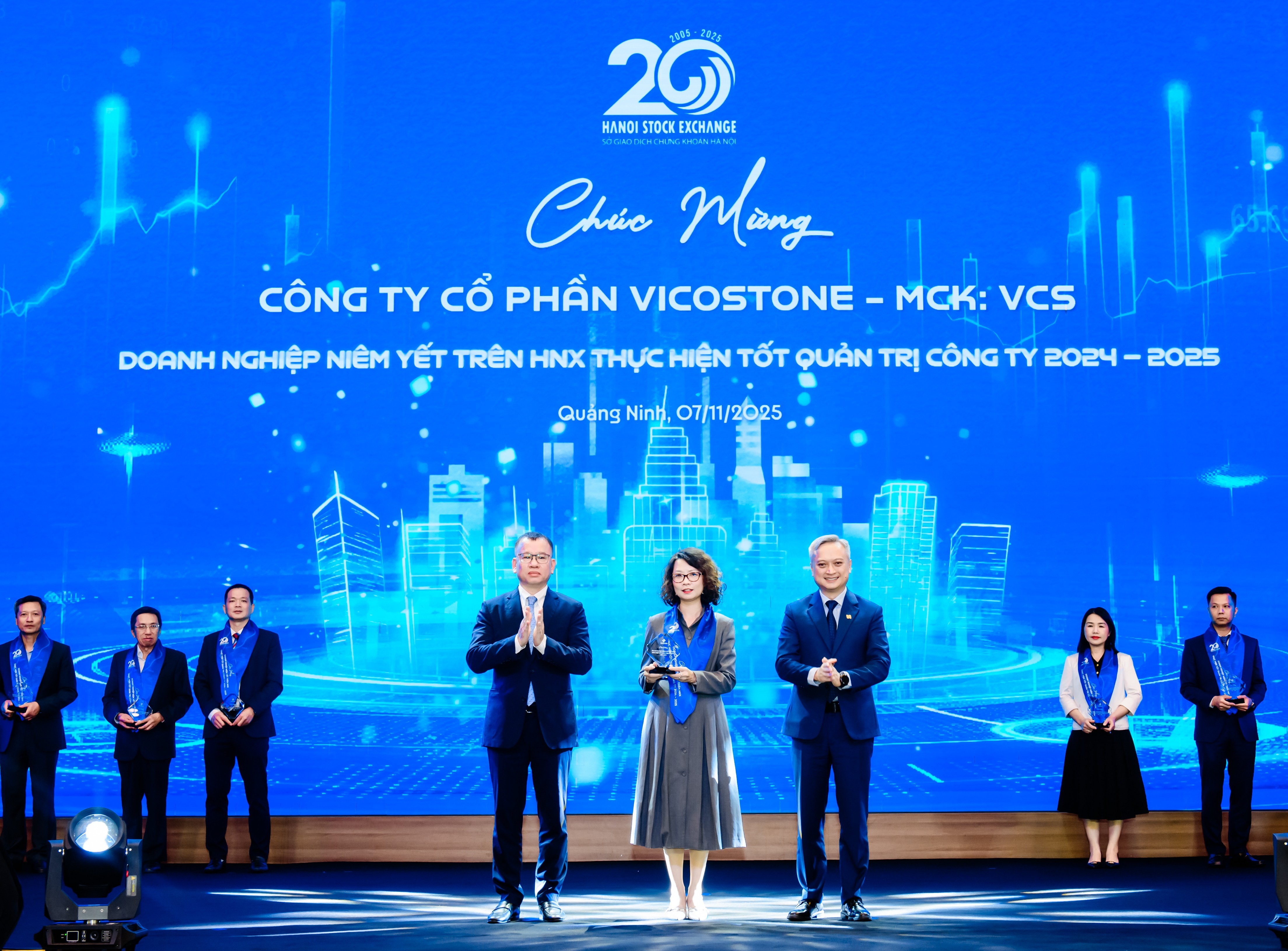 Tại Hội nghị Doanh nghiệp Thường niên do Sở Giao dịch Chứng khoán Hà Nội (HNX) tổ chức mới đây, Công ty Cổ phần Vicostone (mã chứng khoán: VCS) – ĐVTV của Tập đoàn Phenikaa - đã được vinh danh trong Top 10 doanh nghiệp niêm yết thực hiện tốt quản trị công ty giai đoạn 2024 – 2025. Giải thưởng là sự ghi nhận cho những nỗ lực không ngừng của Vicostone trong việc nâng cao năng lực quản trị, xây dựng nền tảng phát triển bền vững và củng cố vị thế trên thị trường chứng khoán Việt Nam.