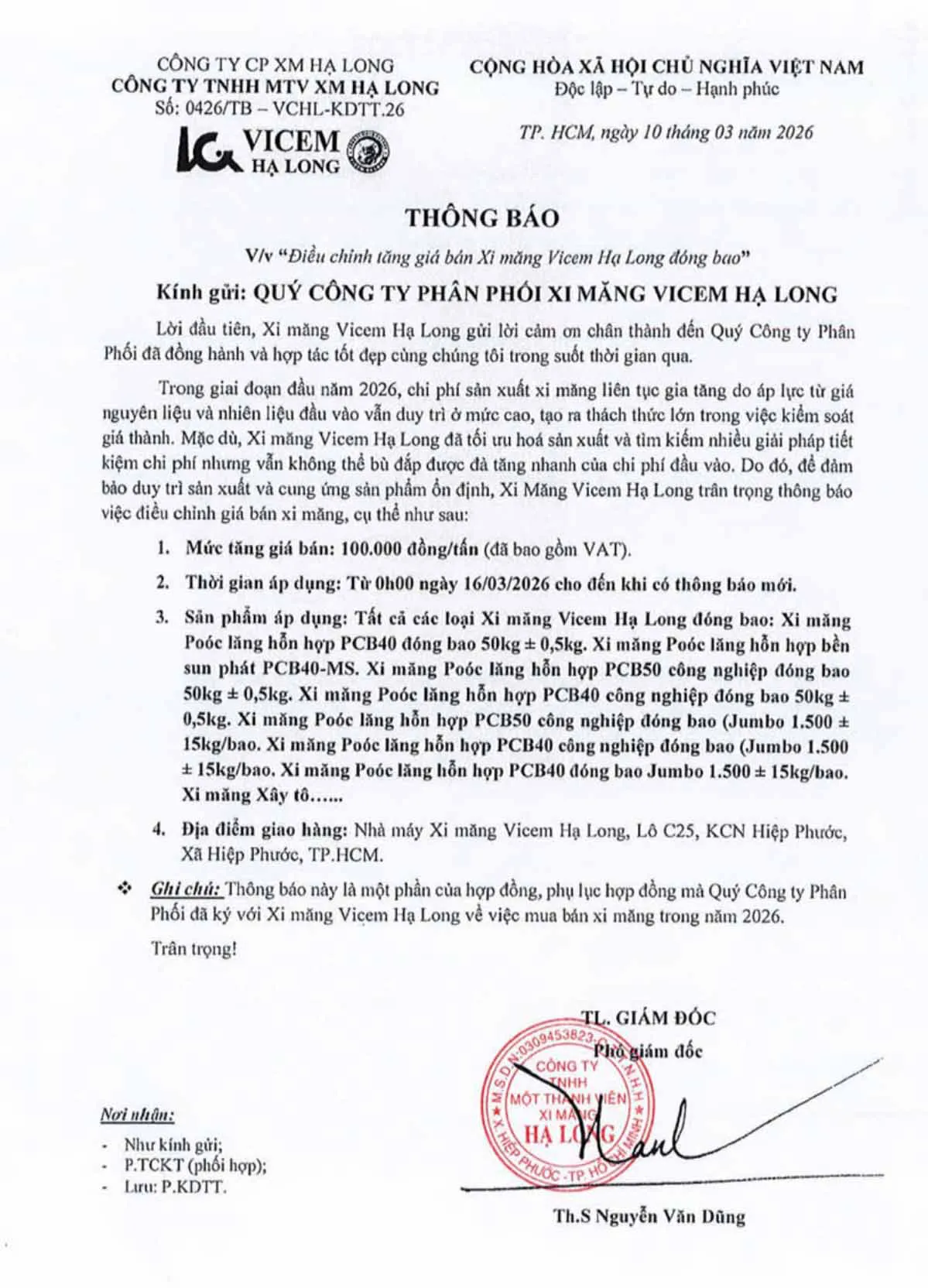 Ngay từ đầu năm 2026, chi phí sản xuất xi măng của doanh nghiệp liên tực gia tăng, để đảm bảo duy trì sản xuất và cung ứng, Công ty TNHH MTV Xi măng Hạ Long điều chỉnh tăng giá bán từ ngày 16/3 đối với tất cả các sản phẩm Xi măng VICEM Hạ Long đóng bao thêm 100.000 đồng/tấn (đã bao gồm VAT) tại nhà máy Xi măng VICEM Hạ Long (KCN Hiệp Phước, TP.HCM).
