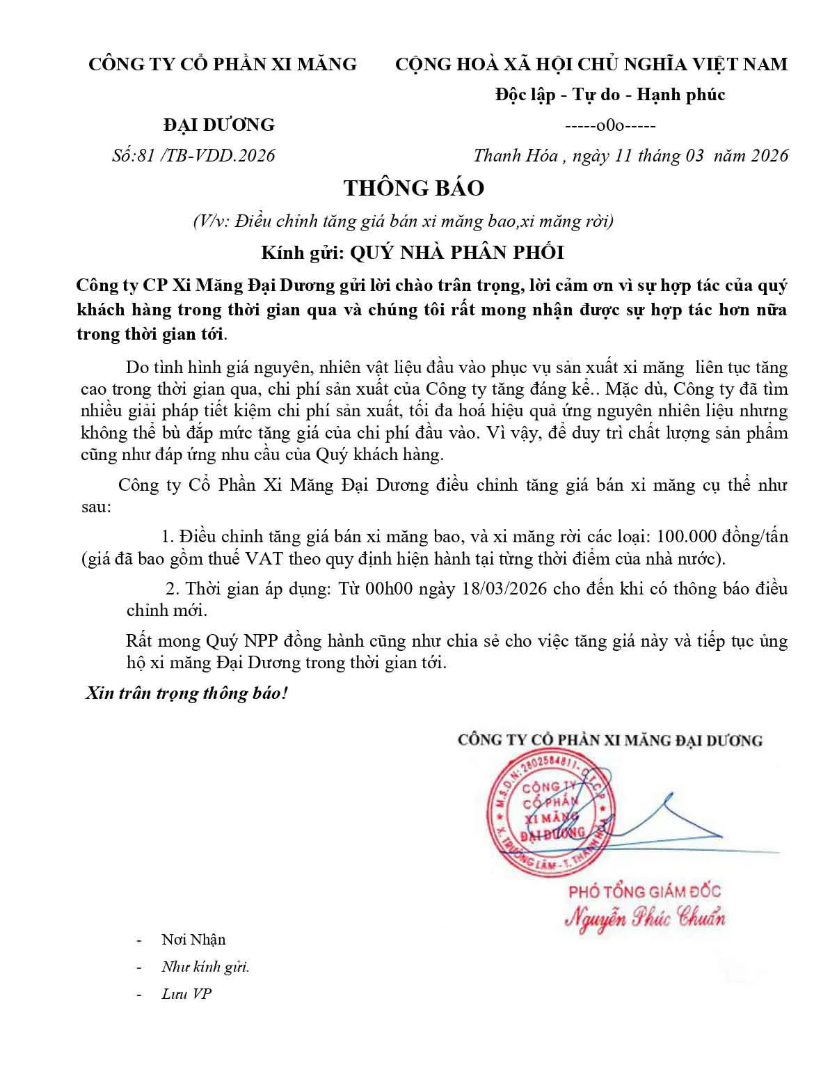 Đối với, Công ty CP Xi măng Đại Dương, doanh nghiệp cho biết sẽ điều chỉnh tăng giá bán xi măng bao và xi măng rời thêm 100.000 đồng/tấn (đã bao gồm VAT) từ ngày 18/3/2026 cho đến khi có thông báo mới. Động thái này diễn ra trong bối cảnh trước đó doanh nghiệp xi măng này đã điều chỉnh giảm mức chiết khấu thương mại đối với một số thị trường từ đầu tháng 3.