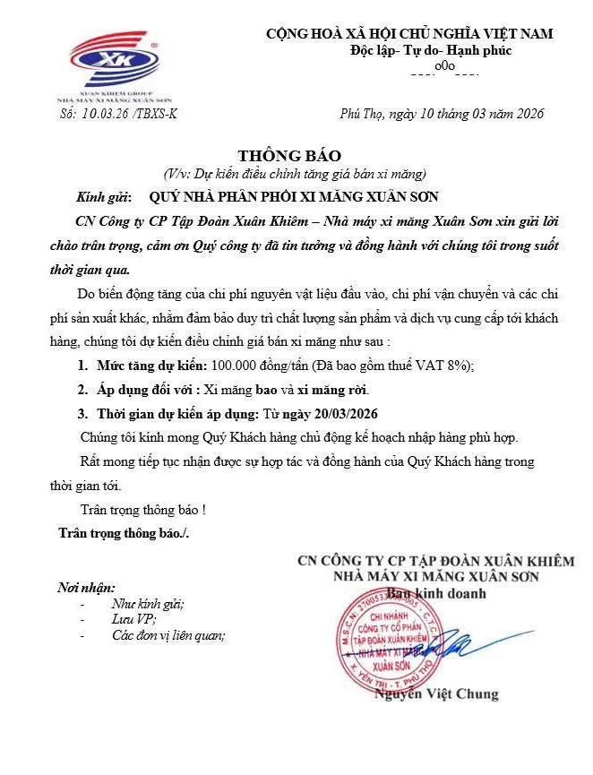Theo thông báo mới đây của nhà máy Xi măng Xuân Sơn (Công ty CP Tập Đoàn Xuân Khiêm), dự kiến tăng giá bán xi măng thêm 100.000 đồng/tấn (đã bao gồm thuế VAT 8%) đối với cả xi măng bao và xi măng rời từ ngày 20/3, trong bối cảnh chi phí nguyên vật liệu đầu vào, vận chuyển và chi phí sản xuất liên tục biến động.