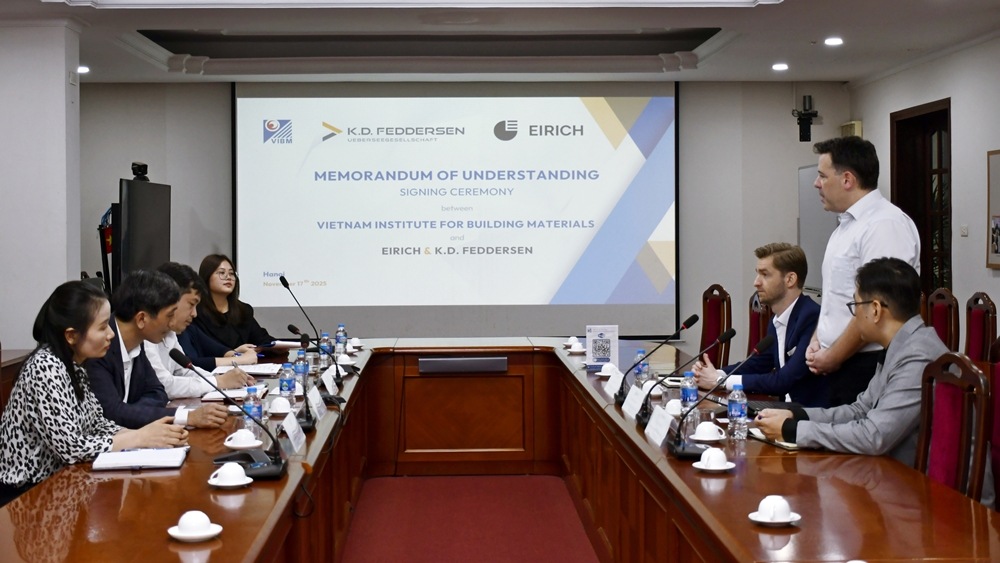 Nhằm tăng cường hợp tác khoa học - công nghệ, đặc biệt trong lĩnh vực định lượng, trộn, tạo hạt, nghiền và sấy phục vụ nghiên cứu và sản xuất vật liệu xây dựng (VLXD), ngày 17/11/2025, Viện Vật liệu xây dựng (VIBM) đã ký kết Thỏa thuận hợp tác với Maschinenfabrik Gustav Eirich GmbH & Co KG (EIRICH) và Công ty TNHH MTV K.D. Feddersen Việt Nam (KDF).