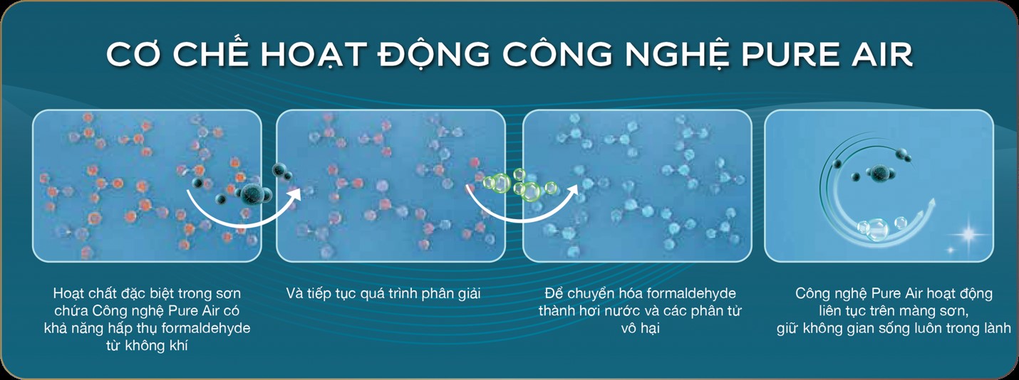 Sơn nội thất Dulux Ambiance AirFresh sở hữu công nghệ Pure Air vượt trội giúp phân giải formaldehyde thành các phân tử vô hại