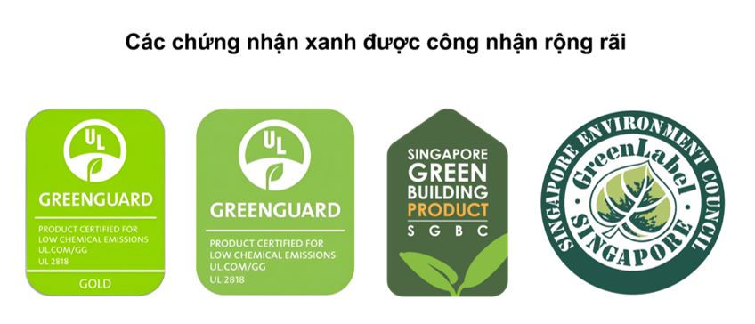 Theo ông Quang, trên thị trường quốc tế hiện nay có ba chứng nhận được công nhận rộng rãi bao gồm: GREENGUARD Gold và GREENGUARD từ UL Environment – Mỹ, và Singapore Green Building Product (SGBP) của Hội đồng Công trình Xanh Singapore (SGBC). Tại Việt Nam, Hội đồng Công trình Xanh Việt Nam (VGBC) cũng có danh sách vật liệu sơn phát thải thấp (Low VOC) với mức độ phát thải TVOC cụ thể cho các chủng loại sơn, để ưu tiên sử dụng trong các công trình xanh.