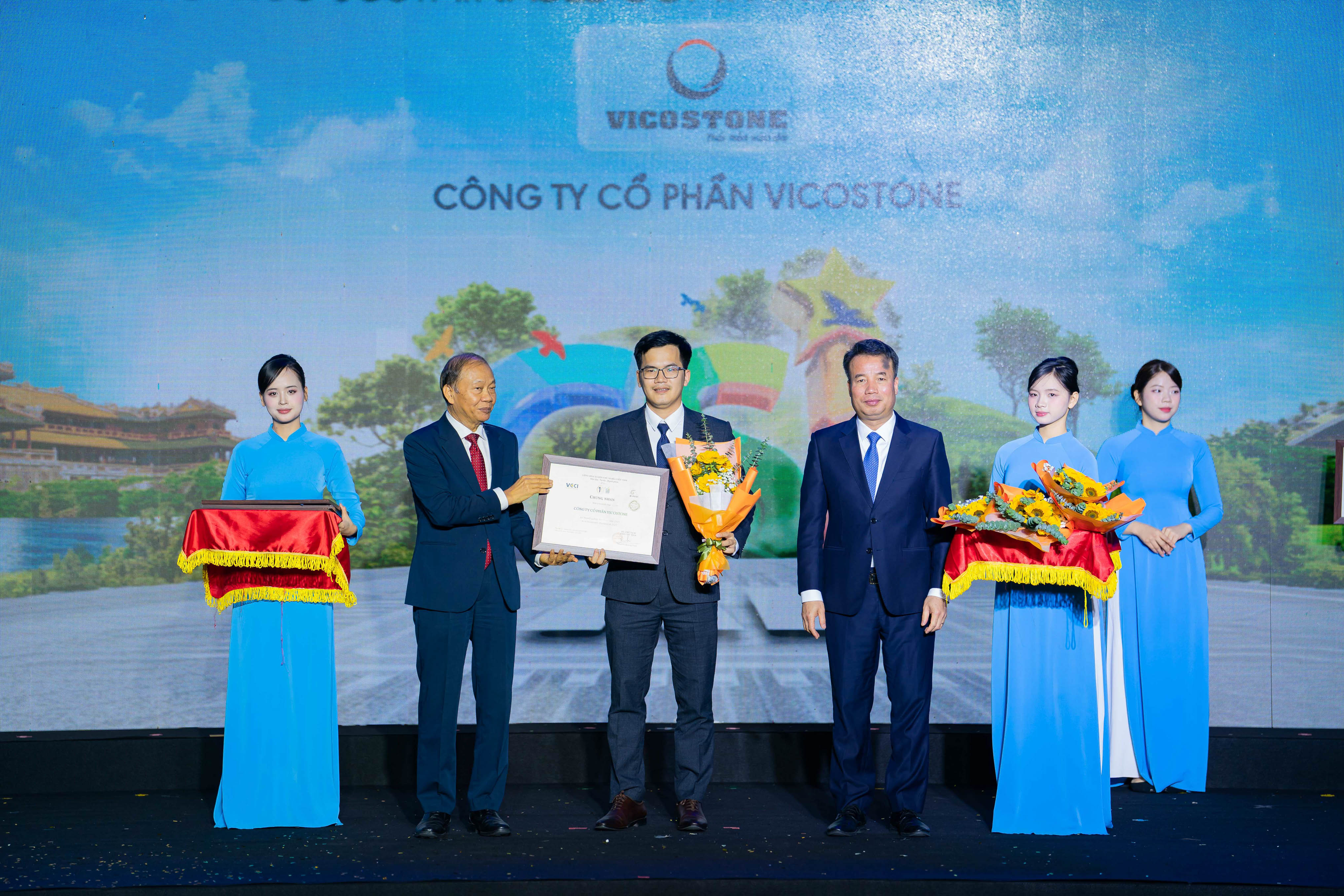 Ông Đồng Quang Thức – Phó Tổng Giám đốc Vicostone đại diện Công ty nhận giải tại hạng mục Top 5 Doanh nghiệp thực hiện tốt quản trị công ty bứt phá 2025 bên cạnh giải thưởng Top 100 DN PTBV