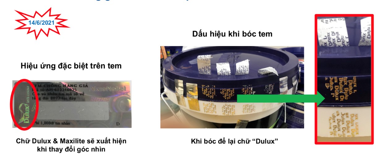 Hiện nay, tất cả bao bì sơn Dulux và Maxilite đều được trang bị tem chống giả có các hiệu ứng nhận biết trực quan. Khách hàng có thể dễ dàng kiểm tra bằng cách thay đổi góc nhìn để thấy chữ thương hiệu hiện lên rõ nét trên bề mặt tem. Khi bóc, tem trên sản phẩm thật sẽ để lại các hàng chữ Dulux và Maxilite.